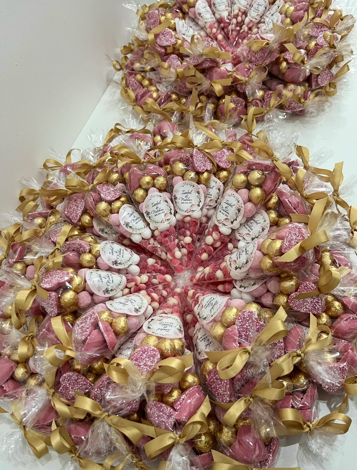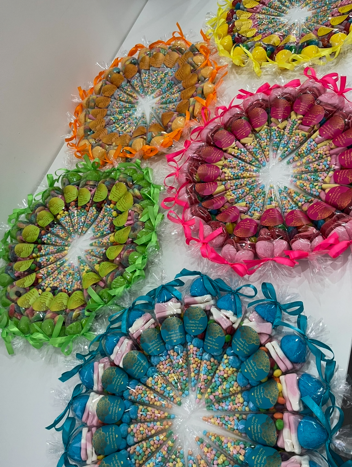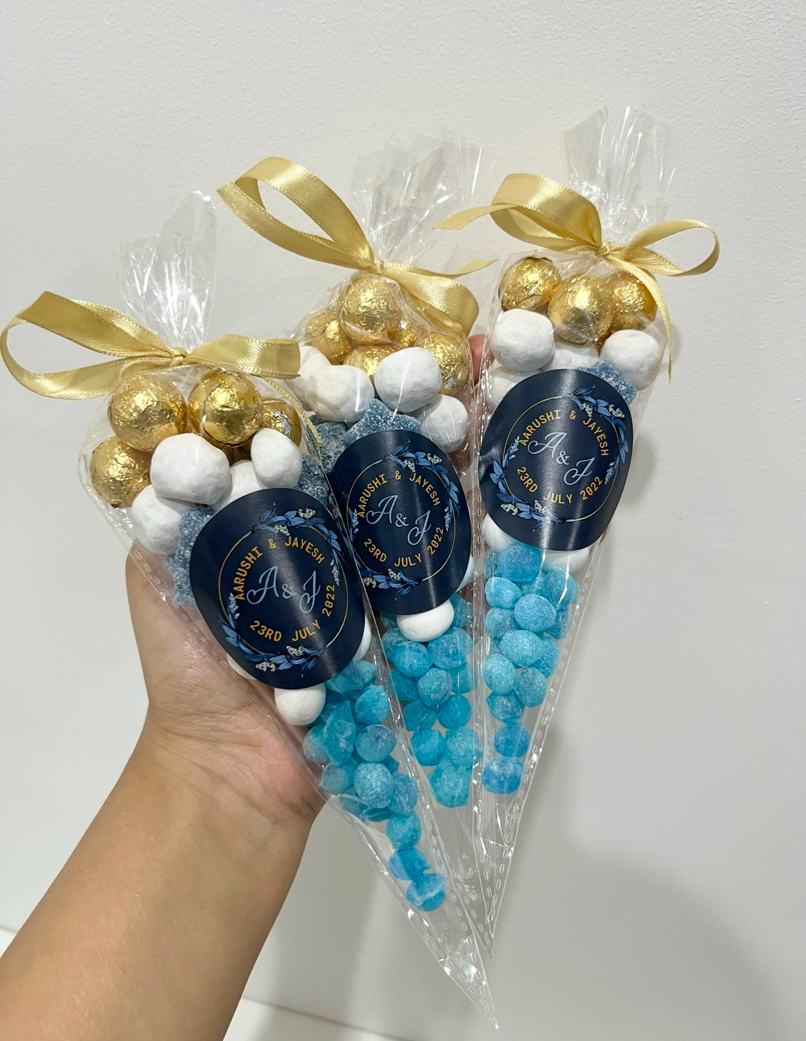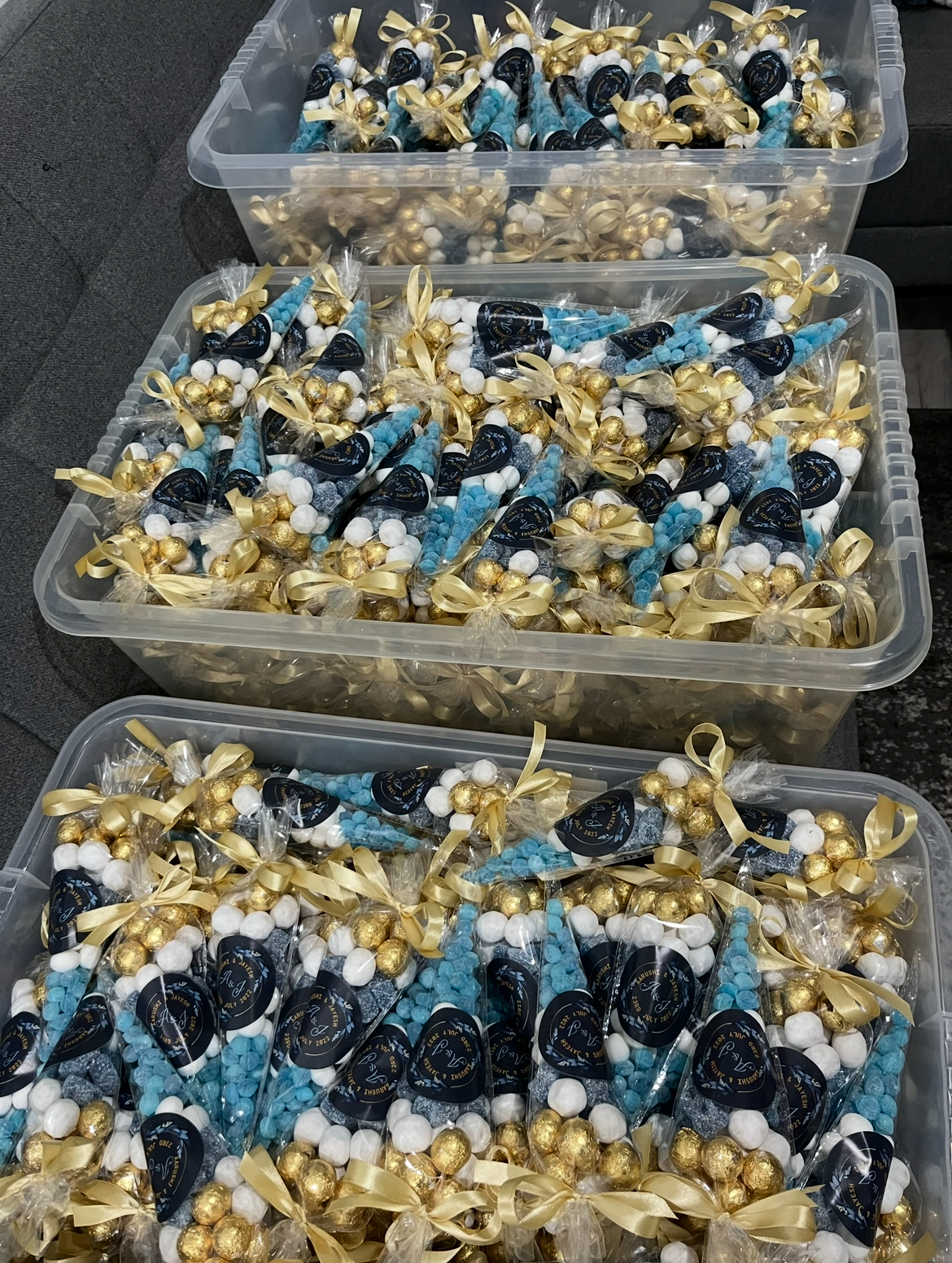 Delight your guests with our small personalised sweet cones — the perfect treat for any occasion. Each cone is filled with a mix of sweets and finished with a custom label featuring your logo, name, or special message.